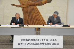 1月21日(水)、備前市と一般社団法人岡山まちの賑わい創出協会は包括連携協定の締結式をおこないました。 災害発生時などに被災者の食料支援に資することを目的として、包括連携協定を締結し、災害時の避難所などで、キッチンカーを用いて炊き出しの実地協力、避難者等に温かい飲食の提供を目的としています。